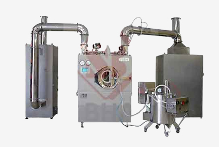The application of the coating material is done on a continuously moving bed of tablets. There is a system that also ensures rapid removal of the solvent using a hot air current. Product to be coated are placed in a closed drum, that is in continuous orbital motion , and the coating system sprays the coating material evenly in rotating motion to avoid excess deposit on the tablets.